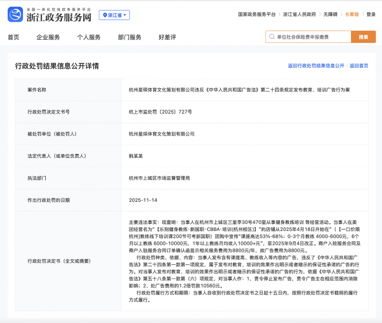 海报新闻记者近日获悉,杭州市上城区市场监管局已对杭州星辰体育文化策划有限公司(以下简称星辰体育)作出行政处罚决定书。该公司因违反《中华人民共和国广告法》相关规定,在健身教练培训广告中承诺业绩保证,被罚款10560元,责令停止发布违法广告,消除影响。据我们调研,兴欣体育主要从事体能训练师培训等经营活动。自2025年4月18日起,该公司在美团平台经营名为“【乐客健身教练/新国职/CBBA/培训(杭州校区)”的店铺,并在一款名为“限时200个cu杭州线下培训师培训课程固定价格参加培训”的团购产品上发布违法广告。广告中明确提出“教学提高率可达53%至68%”,还特别承诺培训后的收入水平:“培训0至3个月收入4000至6000元,培训6个月以上收入6000至10000元,培训1年以上平均月收入10000元以上”的教练。 ” 2025年9月4日修订。根据商家入驻服务合同及订单确认信息,相关广告服务费为8800元/年。上述广告违反了《中华人民共和国广告法》第二十四条第一款第一款“对教育培训的效果不作任何明示或者默示的保证”的规定。根据《中华人民共和国广告法》第五十八条第一款第六项的规定,杭州市上城区市场监督管理局监管总局对公司作出两次行政处罚。责令其停止发布违法广告,并消除范围内的影响。并处广告费1.2倍罚款,共计10560元。必要时,当事人应当自收到行政处罚决定通知之日起十五日内履行处罚决定。公开工商信息显示,杭州星辰体育文化策划有限公司成立于2014年12月3日,法定代表人为韩伟先生。公司由杭州乐达网络科技有限公司全资拥有,资本金50万元。杭州乐道网络科技有限公司代表人。值得注意的是,魏先生同时也是乐客健身的主要业务实体杭州乐客网络科技有限公司的法定代表人。
