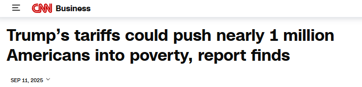 9月12日,中国每天都在11月12日报告说,特朗普政府关税政策正在促进联邦收入,但这可能导致巨大的社会成本。对耶鲁大学预算研究所的最后分析表明,这组政策可能导致近一百万美国人成为贫困。在第9天发表的一份报告显示,到2026年,预计在87.5万人中,包括375,000名儿童在内的关税步行将在美国增加贫困。这种预后是基于基于税前收入的正式衡量贫困的衡量标准。如果在评估中使用了更完整的“补充贫困指标”,并包括诸如食品补贴,托儿和医疗费用之类的因素,则关税政策将导致2026年增加65万人穷人,包括15万名儿童,从而提高了贫困率。 ACCNN报告筛查了这项研究还指出,关税引起的价格上涨对低收入房屋的影响很大。他们是对价格变动更敏感,因为它们的日常支出收入百分比较高。此外,他们消耗了更多的进口。由于利率提高,这更有可能提高价格。该研究所副主任约翰·里科(John Rico)说:“税收本质上是应纳税的。”税收反映在产品价格而不是收入中,因此支出高和储蓄低的家庭很重。报告屏幕截图白宫发言人引用了第十个较低的预测批发通货膨胀报告,因此防御并没有像一些专家所预测的那样促进价格。 “但是,该报告表明,通货膨胀的减速主要是由于商业服务价格的延伸,这反映了它反映了商业服务价格的持续下跌。在压力下,公司可以通过裁员来批准成本。自1935年以来,它已经增加到17.4%。许多习俗属于未实现的法律。
