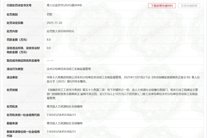 海报新闻记者 孙来宾报道 近日,信用中国、信用能源网站相继发布对中铁十八局集团有限公司及其子公司(中铁十八局集团隧道工程有限公司)行政处罚的信息,引起社会广泛关注。据信用中国网站公告称,中铁十八局集团有限公司收到2009年第29号行政处罚决定书。未对服务外包领域劳动用工实施监督管理的清人社会监督处罚(2025)004号。决定书显示,处罚类别为罚款,罚款金额为8万元,处罚决定日为11月26日。“违法行为”一栏显示,该公司未对旗下分包部门的工人用工情况进行监督管理。该公司因“职业安全检查检查死”被处罚11月18日下发的奥人社勘令字[2025]029号,尚未审核。同时,信用能源网站还发布了对中铁十八局集团隧道工程有限公司行政处罚的信息。该公司因领取新的电力安装(修、试)许可证,受到华中能源监督管理局警告并处以2万元罚款。伪造劳动合同和技术经理聘任文件的,处罚日期为11月25日。