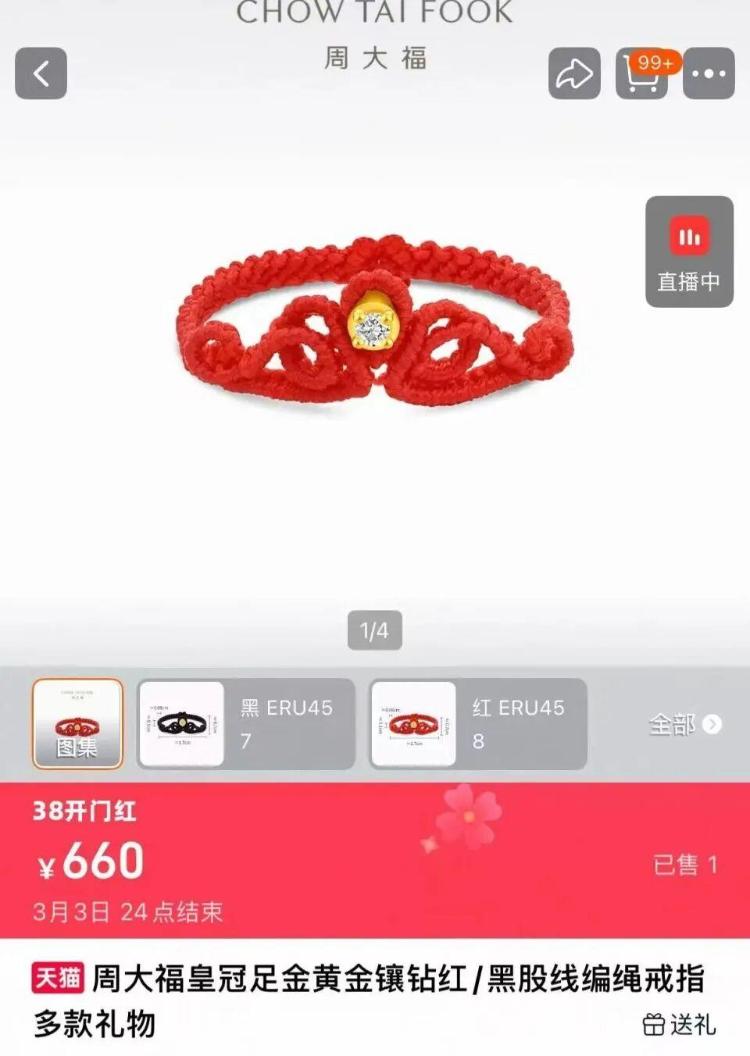 最近,周大福新款0.1克纯金编织绳戒指引起热议。该系列戒指采用0.1克纯金,精心编织的绳索,售价660元,因此网友戏称为“大方还是小气的小选择”、“设计师致力于让黄金让每个人都买得起”。 2月24日,搜索周大福官方网上旗舰店发现,这款编织绳戒指售价为新台币660元,总重量约0.2克,黄金重量约0.1克。我们发现有些款式缺货。对此,周大福总店客服表示,很多黑绳款的顾客都是因为想了解更多而订购的,目前已经缺货。还有一种比较流行的红绳款式。平时使用时,避免撞击或用力拉扯,避免在做家务、睡觉、洗澡等时使用。如果编织绳变色或损坏,可以去商店进行清洁保养,然后重新编织。网友评论:(Ecovisión直播)
