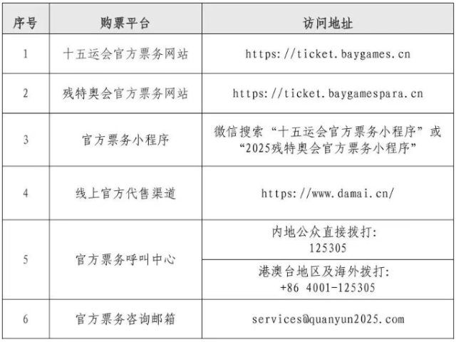 11月14日,第十五届全国残奥会秘书处(法务办公室)和第十五届全国残奥会票务中心联合发布了《关于谨慎通过官方渠道购买第十五届全国残奥会门票的通知》。全文如下: 关于提醒公众通过第十五届全国运动会和残奥会官方渠道购买门票的公告。近日,有观众反映,一些非官方票务平台正在销售十五运会和特残奥会门票。为保护消费者合法权益,抵制炒作和非法倒卖门票,现将有关事项公告如下: 1、“飘牛”、“摩天轮”等平台并非十运会和残奥会官方门票购买渠道,销售门票构成版权侵权。收到警告后,相关平台停止售票。 2、为保护您的合法权益,请您务必通过第十五届全运会、残奥会官方渠道购买门票。为避免无法入场或财产损失的风险,请不要相信非官方平台发布的门票信息。 3、如通过非官方渠道购买的门票无法使用或存在其他相关问题,建议您保留相关证据,并立即向公安机关报案,并通过法律途径维护您的合法权益。 4、坚决抵制经销商倒票行为。如果您发现涉嫌倒票的线索,请及时向我机关或公安机关举报,协助营造良好的十五运会、残奥会门票购买环境。这是公告。第十届全国大会大会/残奥会秘书处(法务室) 第十届全国大会/残奥会票务中心 2025年11月14日 官方购票渠道 1.普通购票渠道/查询 2.官方购票渠道