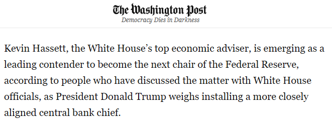 值得一提的是,据说这次哈塞特“被盗”袭击了鲍威尔,这是特朗普眼中联邦储备下一任总统的潜在候选人。 《华盛顿邮报》说,他“在下一任美联储的总统比赛中领先”。