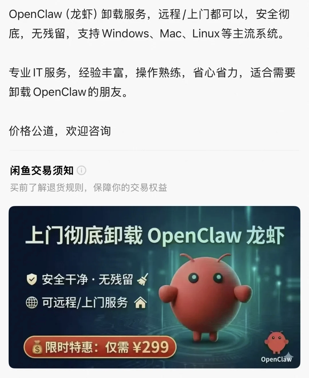 海报新闻编辑刘轩 近日,一款名为OpenClaw(俗称“龙虾”)的开源人工智能代理因其强大的功能而迅速走红,甚至催生了付费安装服务。然而热度并未平息,争议也在酝酿之中。其潜在的安全风险和高昂的使用成本让很多用户迫切地想要摆脱它。 3月10日,记者发现某交易平台出现了卸载OpenClaw的服务。该卖家的IP地址在上海可见,给出的OpenClaw现场卸载费率为299元(仅限上海),远程卸载OpenClaw费率为199元,并称其“安全、完整、无残留”。从雇人“养虾”到花钱“杀虾”,短短几天时间,这只“龙虾”发生了什么?还值得提起吗?月薪2万元,他养不起一只龙虾。在这两天,AI“龙虾养殖”出现在网络上。这种“龙虾”并不是餐桌上的美味佳肴,而是一款名为OpenClaw的开源人工智能代理软件,因其图标酷似红色龙虾而得名。 “蝗虫培育”意味着用户可以通过培训成长,实现办公、数据处理等自动化,但很多人并不知道,这并不是一次性消费。 OpenClaw 是免费且免费的,它的功能依赖于大美洲驼 API 模型的大升级。易于操作和使用的“龙虾”背后,隐藏着巨大的培训消耗。事实上,有用户测算,执行复杂任务的程序调试每天可能要花费数万元。市场上有一种说法,月薪2万元养不起龙虾。对于大多数日常工作量不够的用户来说,这种程度的“水电费”支出ng 远远超过其提供的边际效益。官方认为,这种“虾”可以“咬”人。我再次提醒他,可能有问题。除了“养虾”成本高昂之外,安全风险也是令广大用户望而却步的主要原因。近日,工信部明确警告,OpenClaw开源实例在默认或配置错误的情况下存在被系统抢占权限的风险。中国信息技术通信研究院专家3月10日再次警告,虽然Lobster代理已更新至最新版本,并可能修复已知安全漏洞,但安全风险并未完全消除。用户在使用Lobster等AI代理时,必须了解并落实详细的安全配置要求,养成安全的使用习惯。当日下午,国家互联网应急中心LSO 发布了有关 OpenClaw 安全应用程序的红色警报。此建议指出,默认的安全设置非常薄弱,一旦攻击者发现妥协,他们就可以轻松地完全控制您的系统。目前已出现四大安全隐患:快词注入、误用、功能插件中毒、安全漏洞。对于个人用户来说,它可能导致敏感信息被盗,例如个人数据(照片、文档、聊天记录等)、支付账户、API密钥等。对于金融和能源等主要行业来说,它可能会泄露核心业务数据、商业秘密和代码存储。整个业务系统瘫痪,造成了难以估量的损失。建议相关部门和个人用户在部署和应用OpenClaw时采取四项安全措施:加强网络控制、加强凭证管理、严格控制插件来源、及时更新版本、安装安全补丁es.不要盲目跟风!你适合“养殖龙虾”吗?那么,在这场风险与机遇并存的人工智能狂欢节中,目前谁适合“蝗虫养殖”呢?一个是工程师。他们具有开发能力,可以独立部署pAgent并排除故障。第二类是有明确需求的人。他们的高频、重复性工作可以由“蝗虫”来完成,“蝗虫”员工可以产生可观的利润。第三是一个能承受风险的人。接受潜在的潜力,获得数据或财产,并获得医疗保障,并获得医疗保障和恢复。另一方面,普通上班族、尝鲜者、安全敏感人群则不适合“蝗虫养殖”。对于普通用户来说,与其现在花时间和金钱来养殖“蝗虫”,不如关注并等待技术真正成熟。失控。毕竟尝试新事物是有门槛的,吃好饭别怕迟到。(央视综合新闻、中新网、经济日报、财联社)